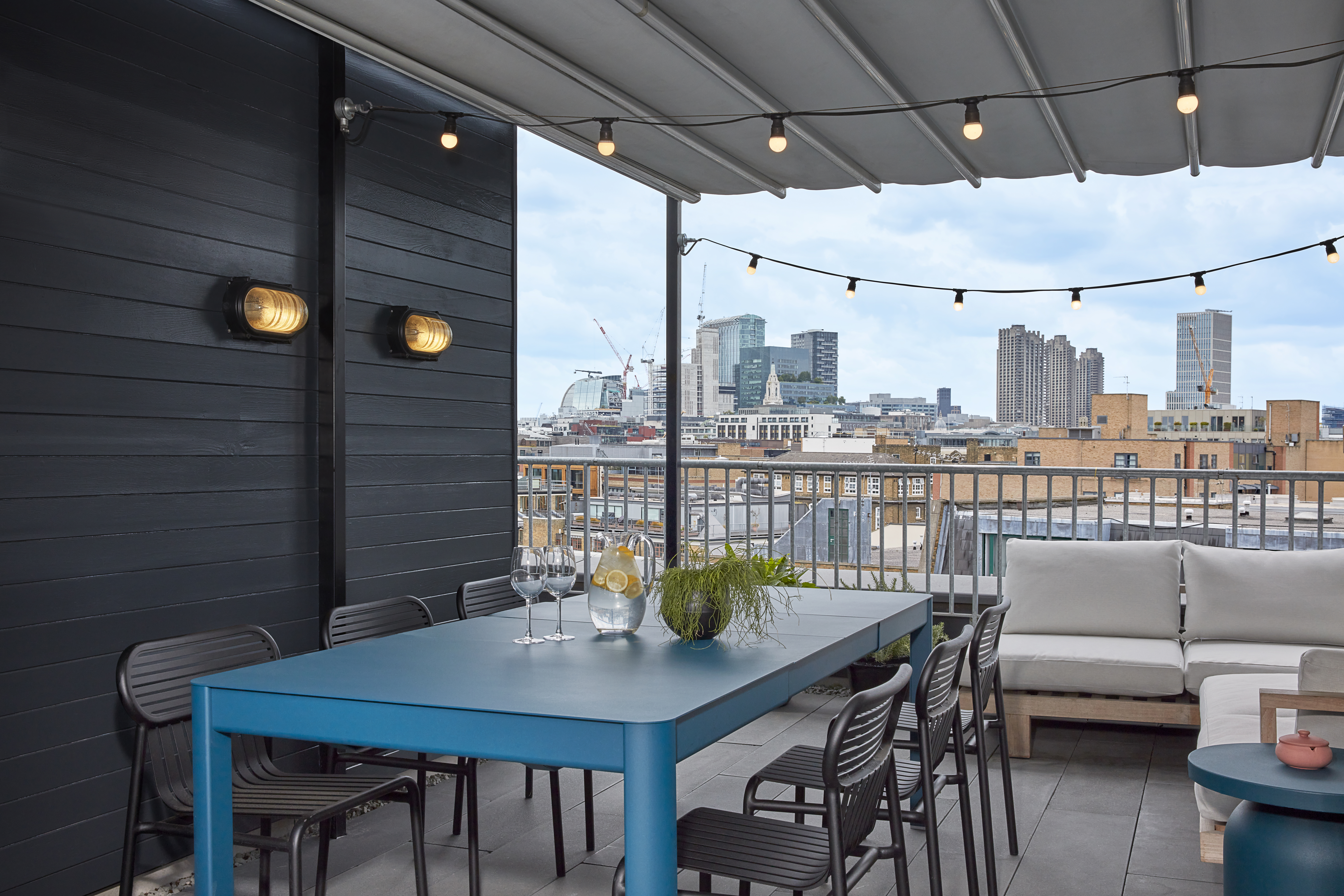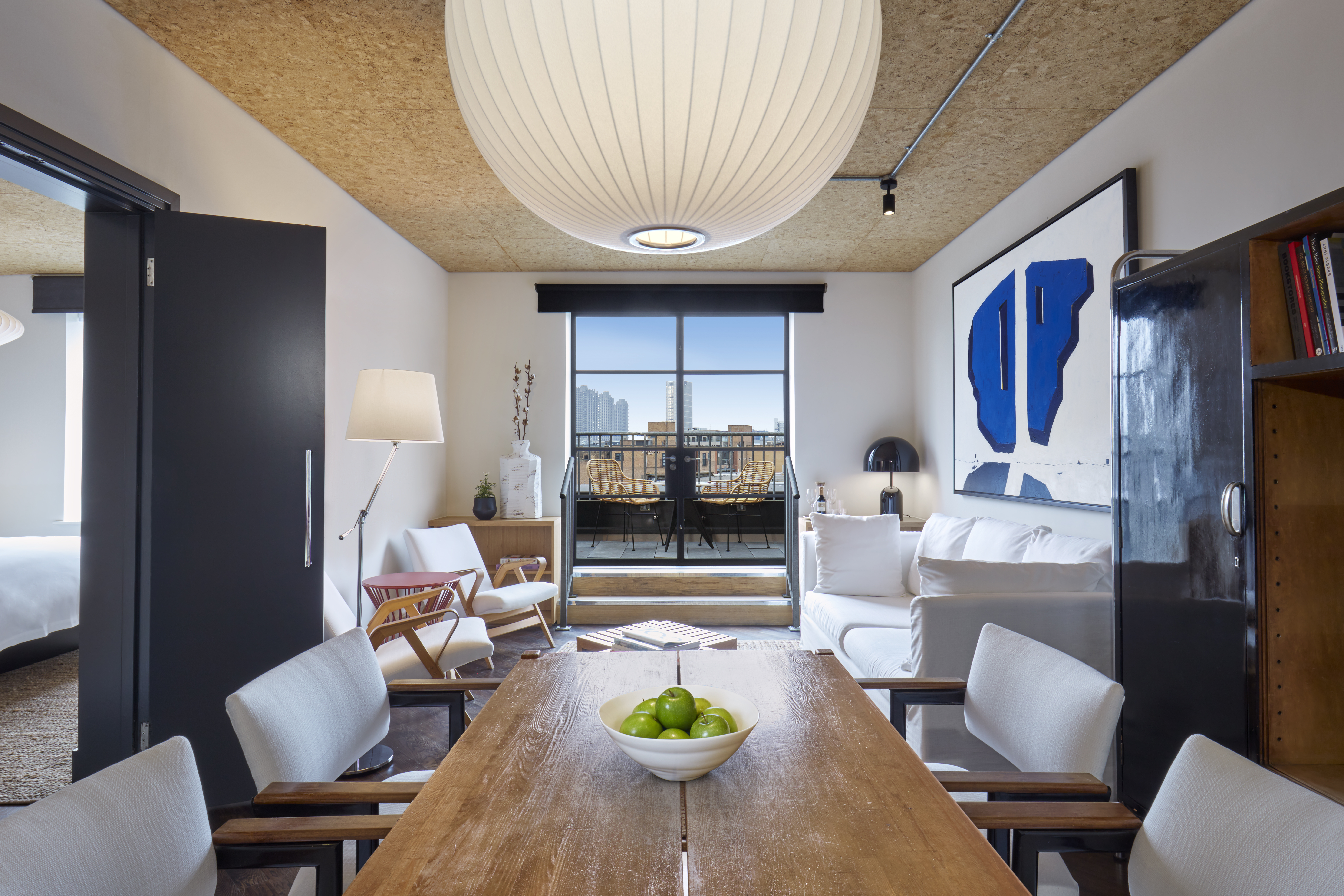 Studio Suite North is our largest suite with comfy sitting and dining room, relaxing bedroom, and a large wrap-around private terrace with views of Shoreditch and space to dine and relax. Furnished with a mix of bespoke and curated vintage furniture, it’s like having your own East London Apartment.