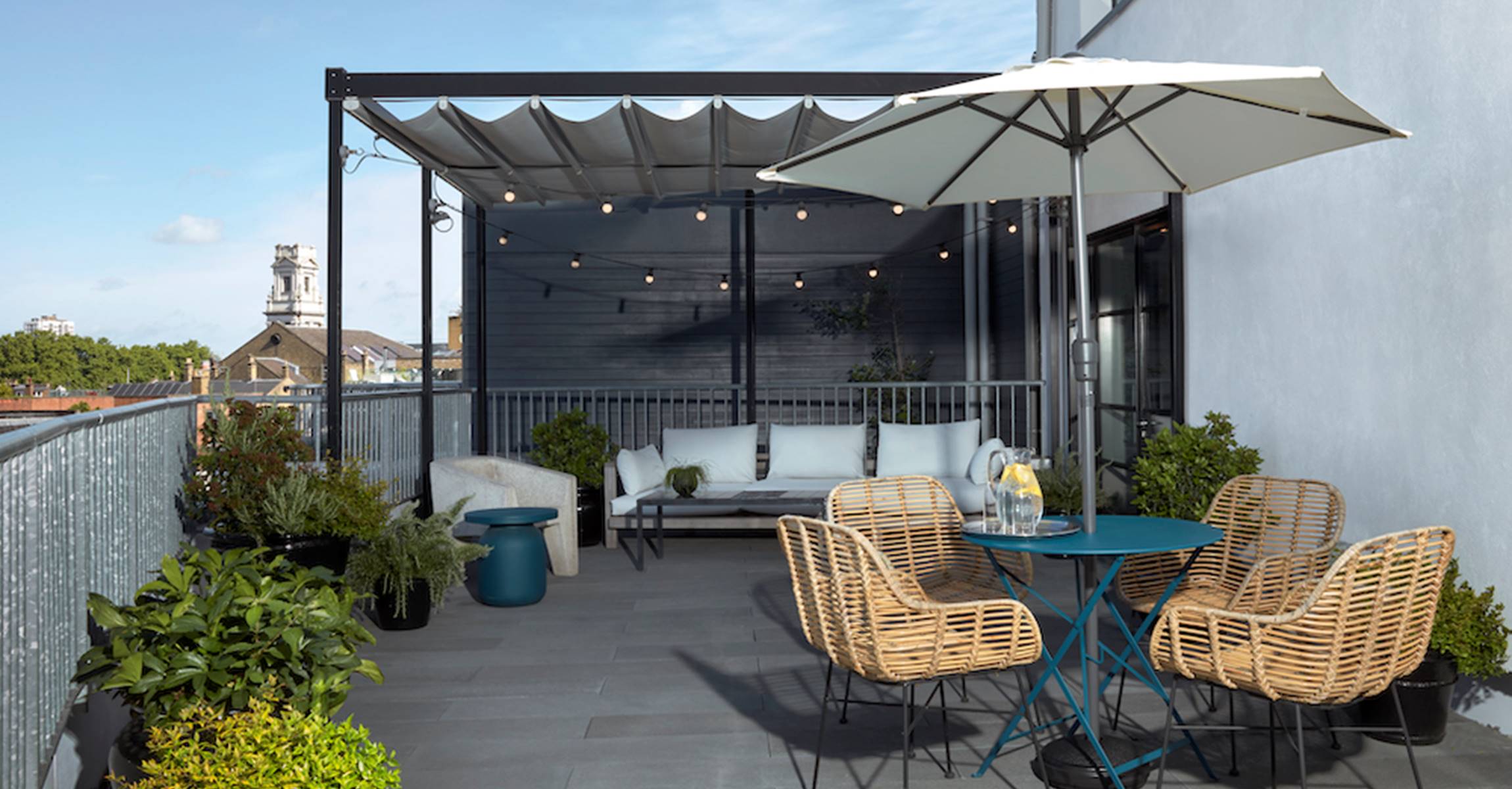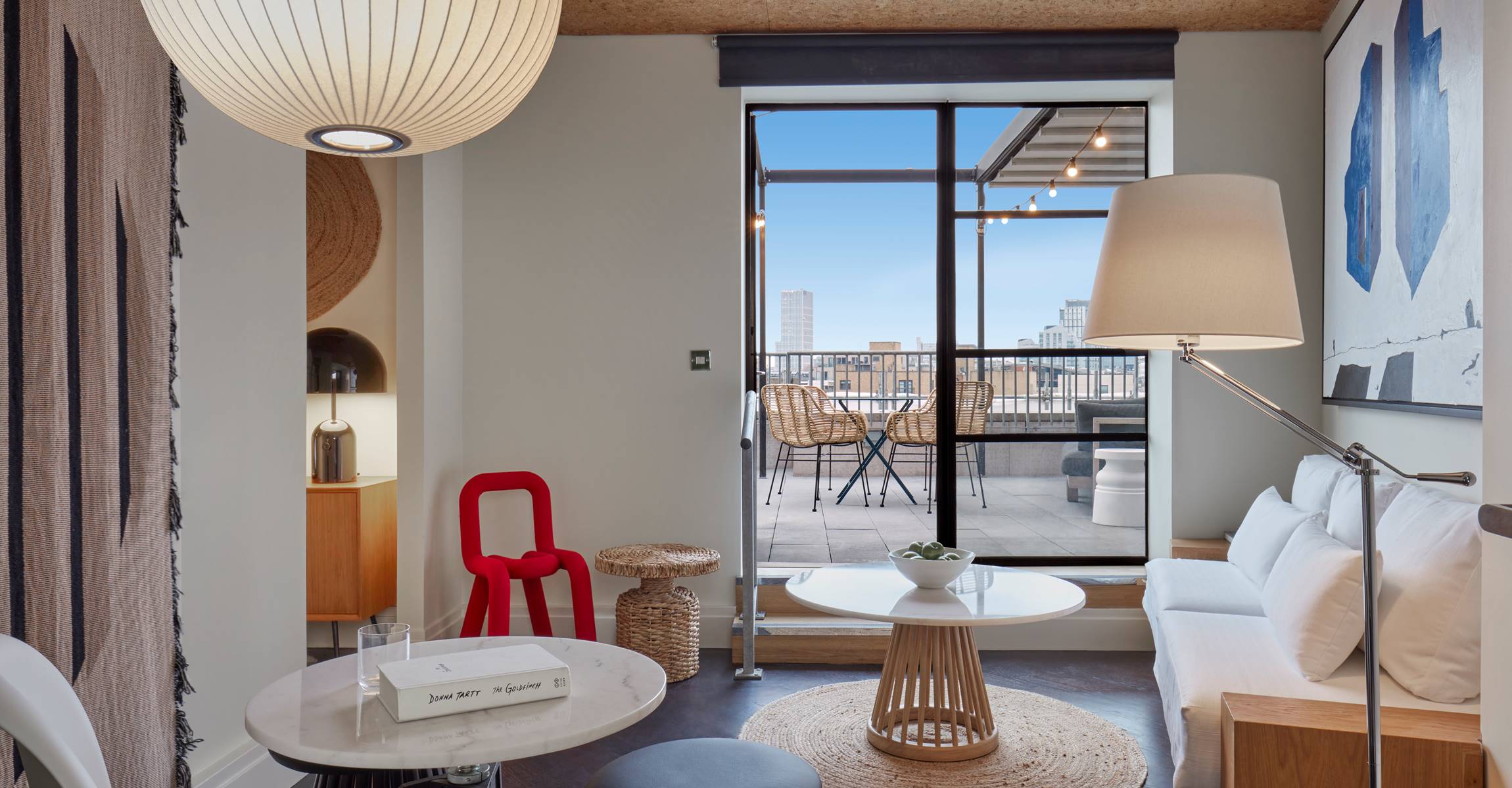 Studio Suite South has a comfy sitting room with comfy sofas and large dining table, relaxing bedroom and a pretty darn large private terrace with views towards the city. Furnished with a mix of bespoke and curated vintage furniture, it’s like having your own East London Apartment.