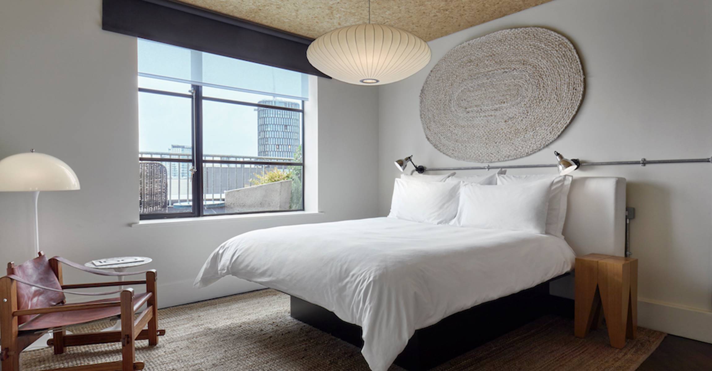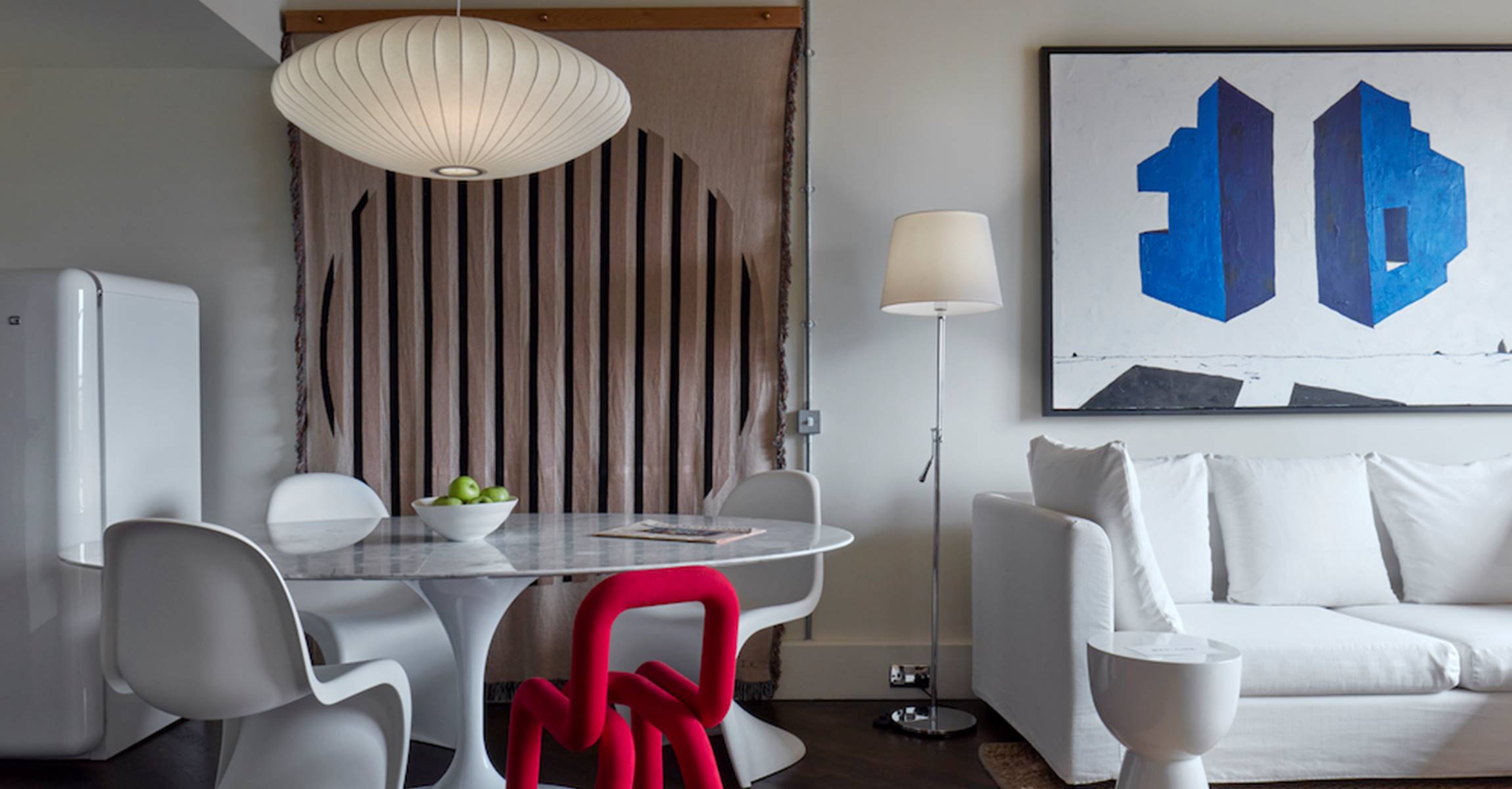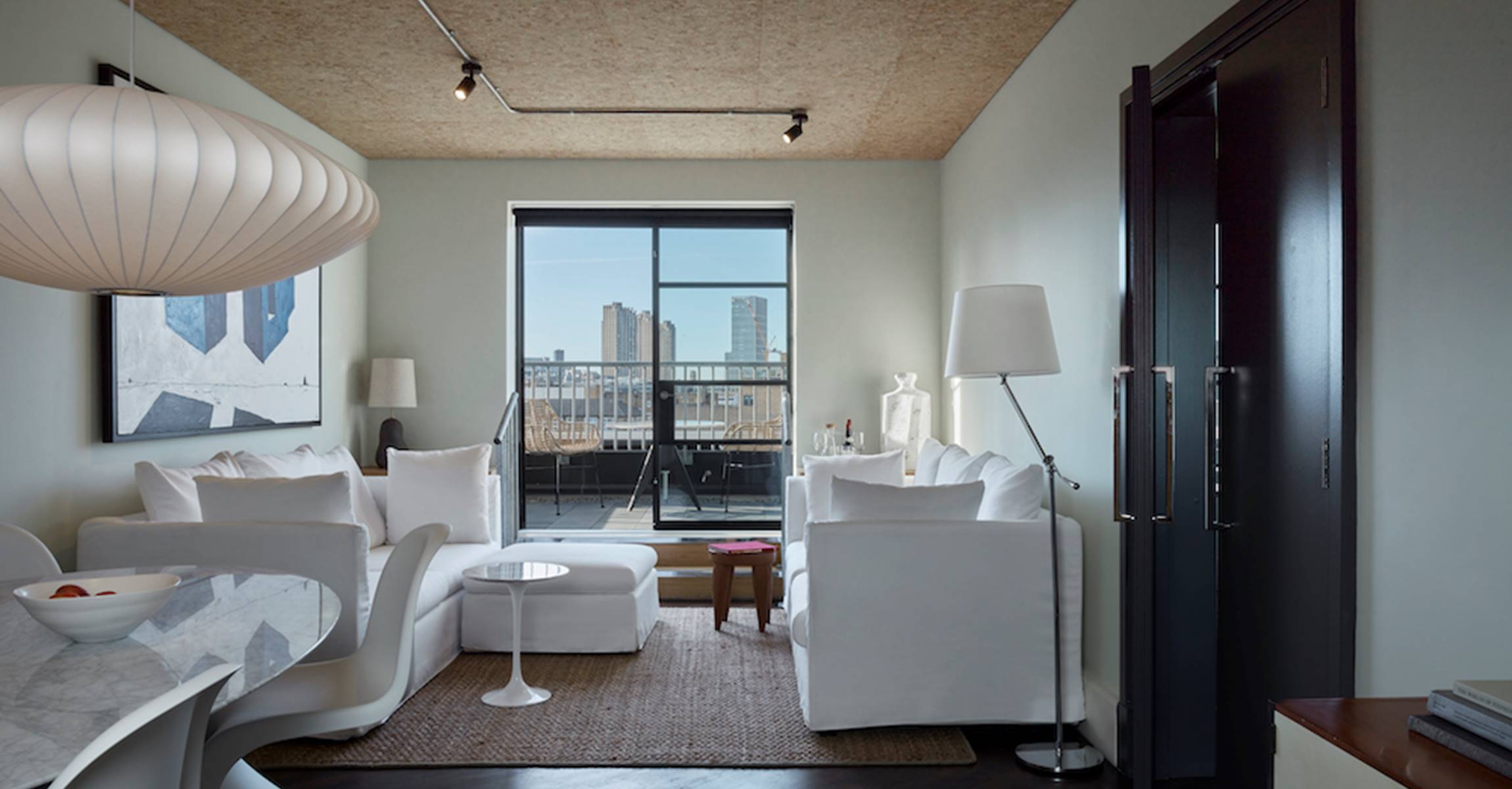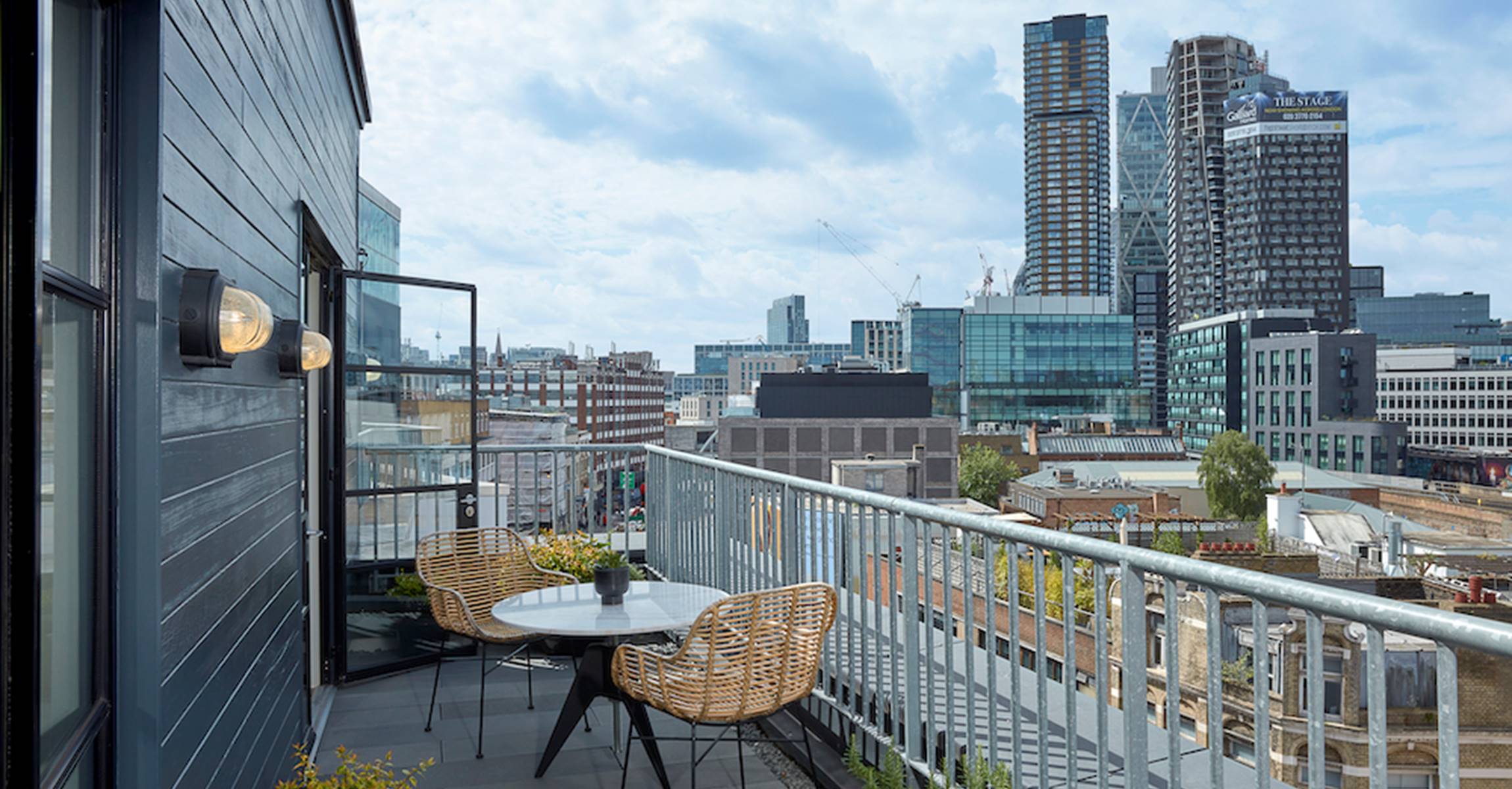 Studio Suite West has a spacious sitting room with comfy seating and large dining table, relaxing bedroom, and a cute private terrace with views over Shoreditch. Furnished with a mix of bespoke and curated vintage furniture, it’s like having your own East London Apartment.