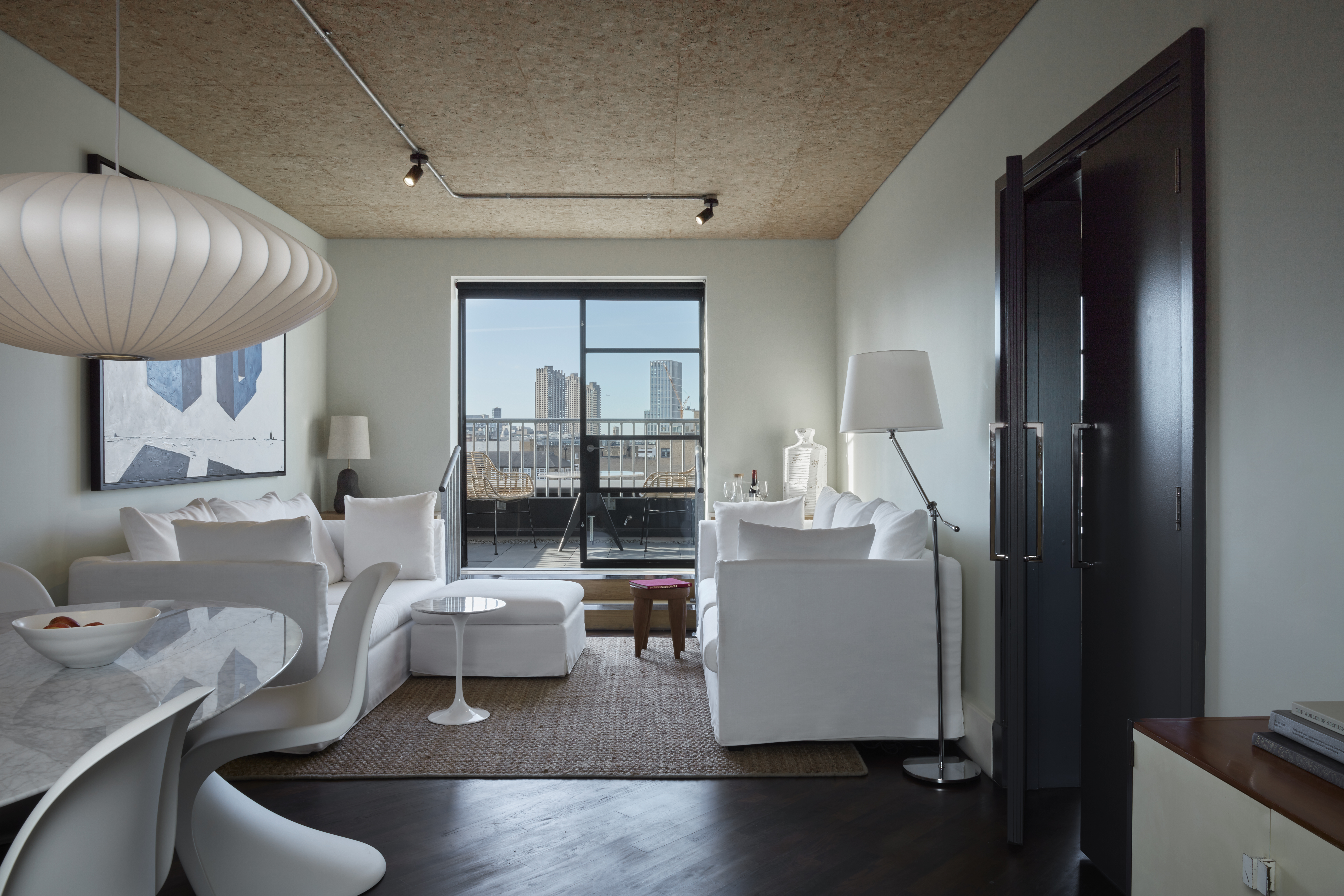 Studio Suite West has a spacious sitting room with comfy seating and large dining table, relaxing bedroom, and a cute private terrace with views over Shoreditch. Furnished with a mix of bespoke and curated vintage furniture, it’s like having your own East London Apartment.
